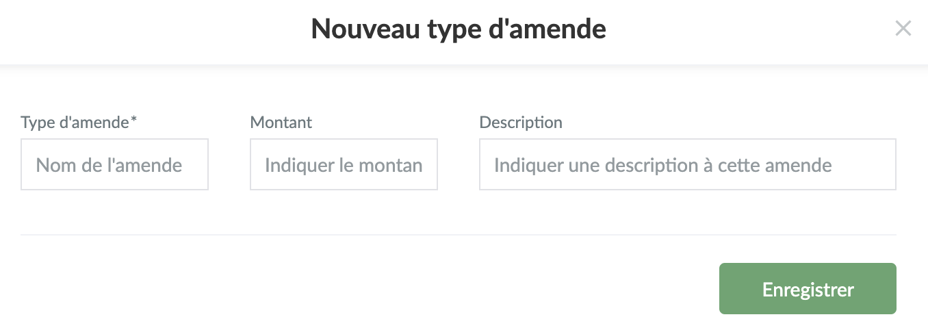 Indiquer le nom de l'amende, le prix et une description de l'amende.