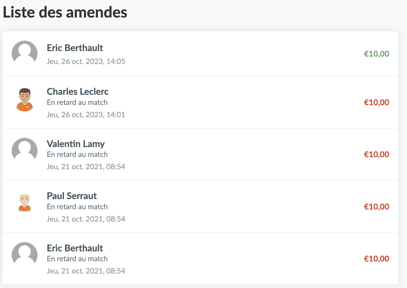 Sous Statistiques dans le menu de gauche et Liste des amendes, vous avez une aperçu de tout les membres de votre équipe ainsi que les montants dû.
