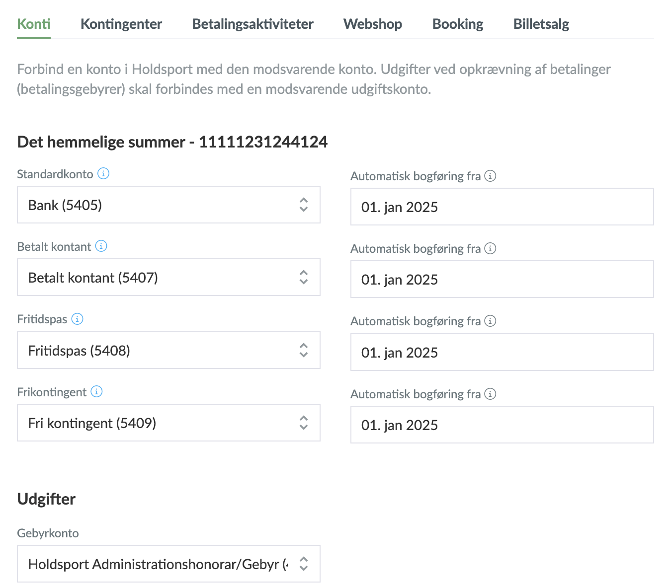 - Sélectionnez également une date de début pour la comptabilisation automatique. - Ensuite, allez dans les onglets Abonnements, Activités de paiement, Boutique en ligne, Réservations et Vente de billets et liez les produits que vous avez créés précédemment aux frais correspondants.