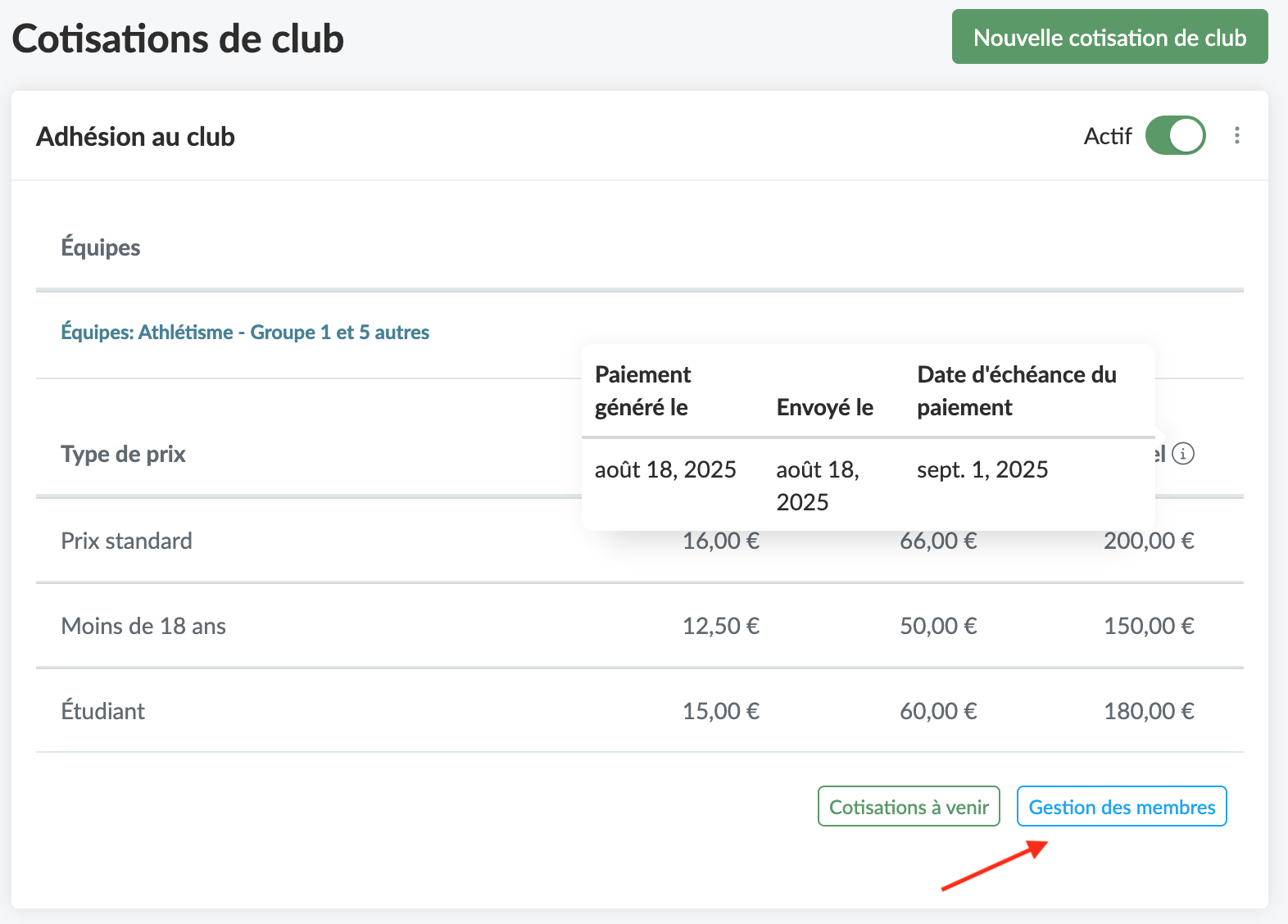 Une fois votre cotisation créée, vous devrez assigner chaque cotisation aux membres inscrits dans le club en cliquant sur le bouton bleu Gestion des membres
